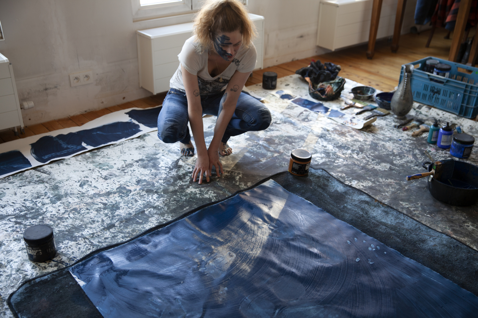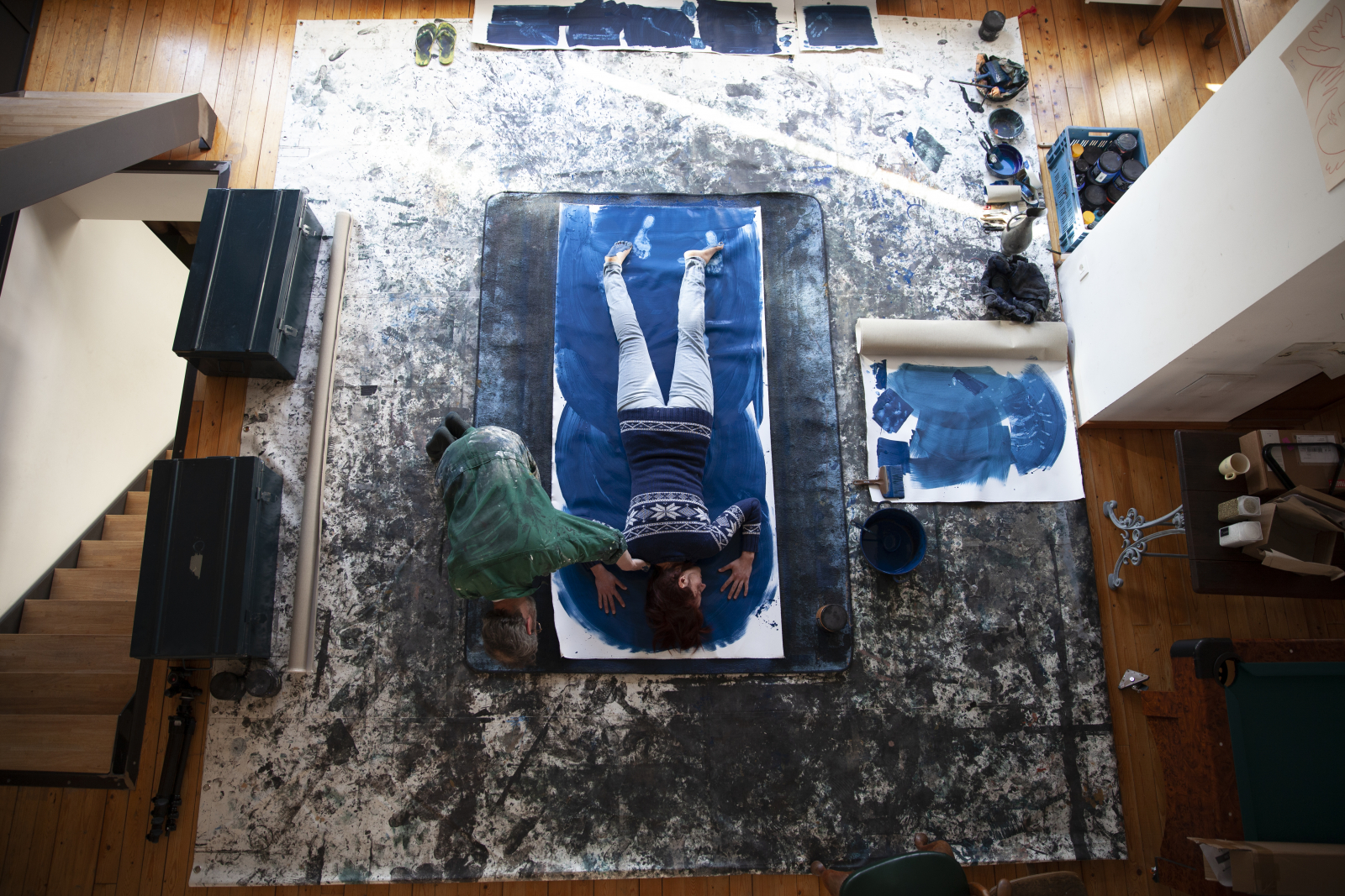 Blueprint: searching for your identity after treatment. Before you make the blueprint of yourself, it is important to think about what exactly you want to leave behind. And then... Lay down in the paint! Leaving everything behind on the canvas. Imprint. To print is to let go and to let go is to create space. You give something to the earth. It happens very slowly. Showering afterwards is also part of it. Rinsing off the ink, what you no longer need. The result is never what you expected...'.