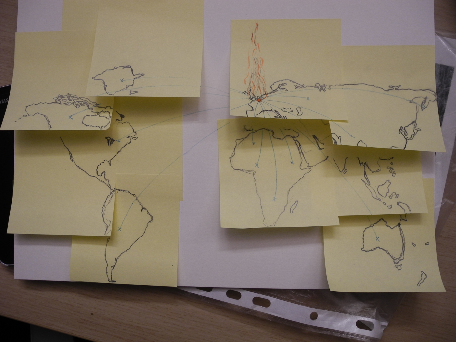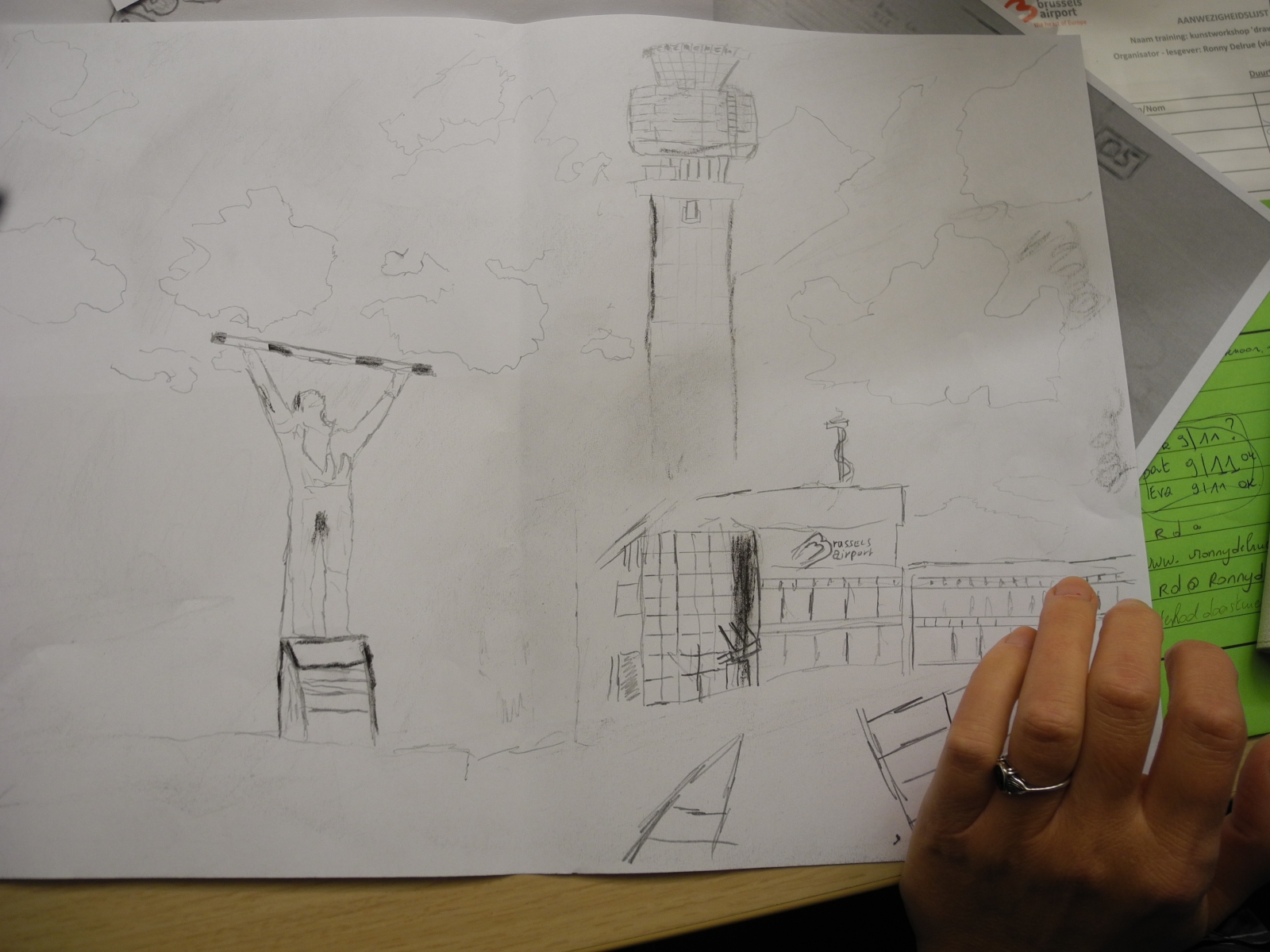 Via deze workshop worden de werknemers van de luchthaven gestimuleerd hun ervaringen betreffende dit trauma van 22 maart 2016 vorm te geven. Het is de bedoeling dat de stress van de job en van thuis opzij worden gezet zodat het hoofd leeg gemaakt kan worden en bepaalde gevoelens een plaats kunnen krijgen. er Er ontstaat een geheel en het groeit via individuele gedachten en gesprekken met mekaar. Het denken vindt zijn weg via eenvoudige tekeningen, collages, teksten, … die als één verzameling bij elkaar gebracht worden. De aparte tekeningen, teksten… tonen een individueel beeld, maar samen vormen ze één installatie! Dit eindresultaat krijgt een plek in de burelen van de luchthaven.