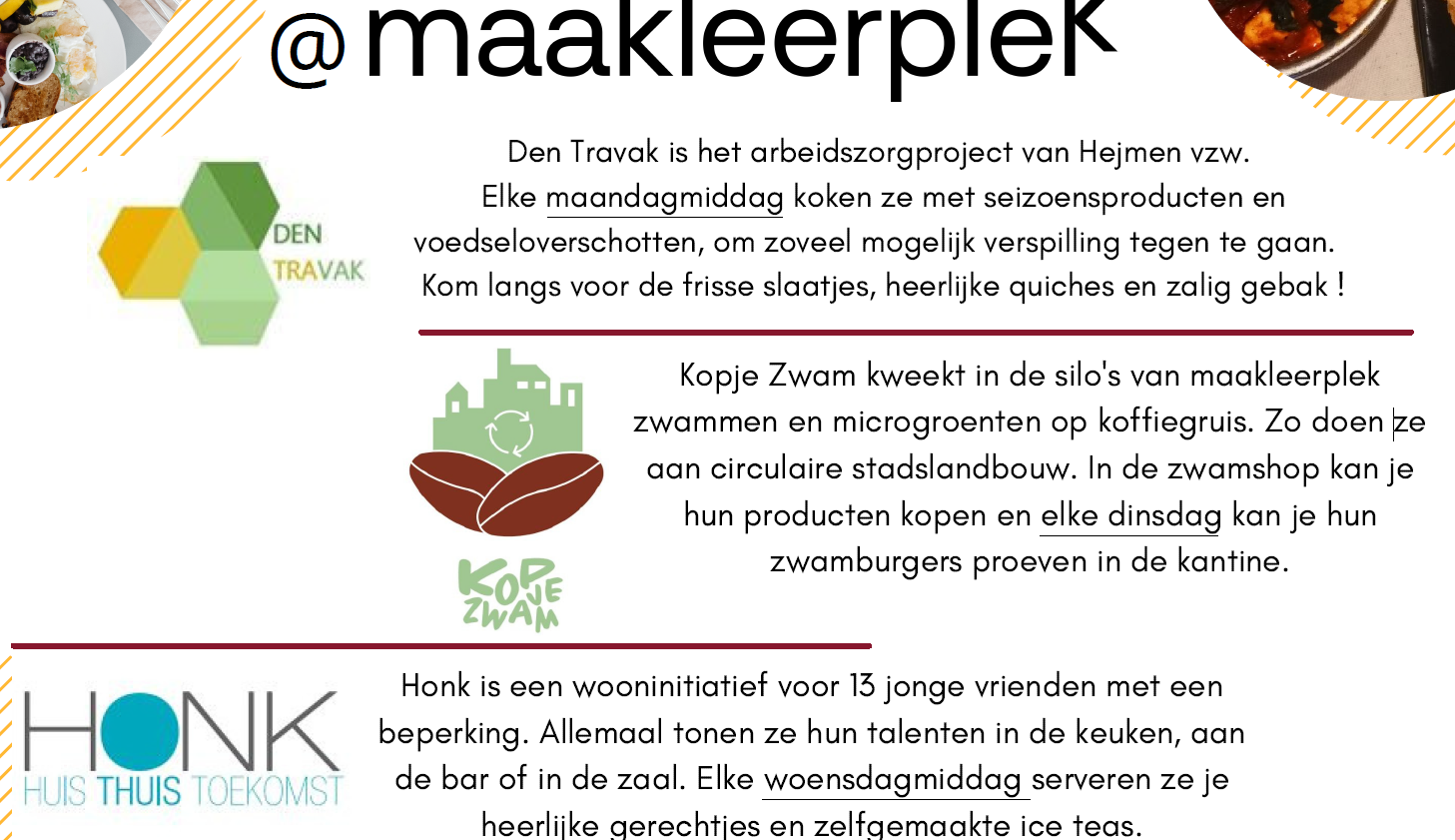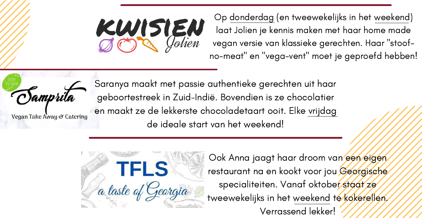 Binnenkort starten we met een uniek zero waste take away concept en er start een vijfde ondernemersteam “Late Quatro”. Vier jonge gasten bieden op dinsdag dan specialiteiten uit de Somalische keuken. Zie Facebook pagina voor alle updates!