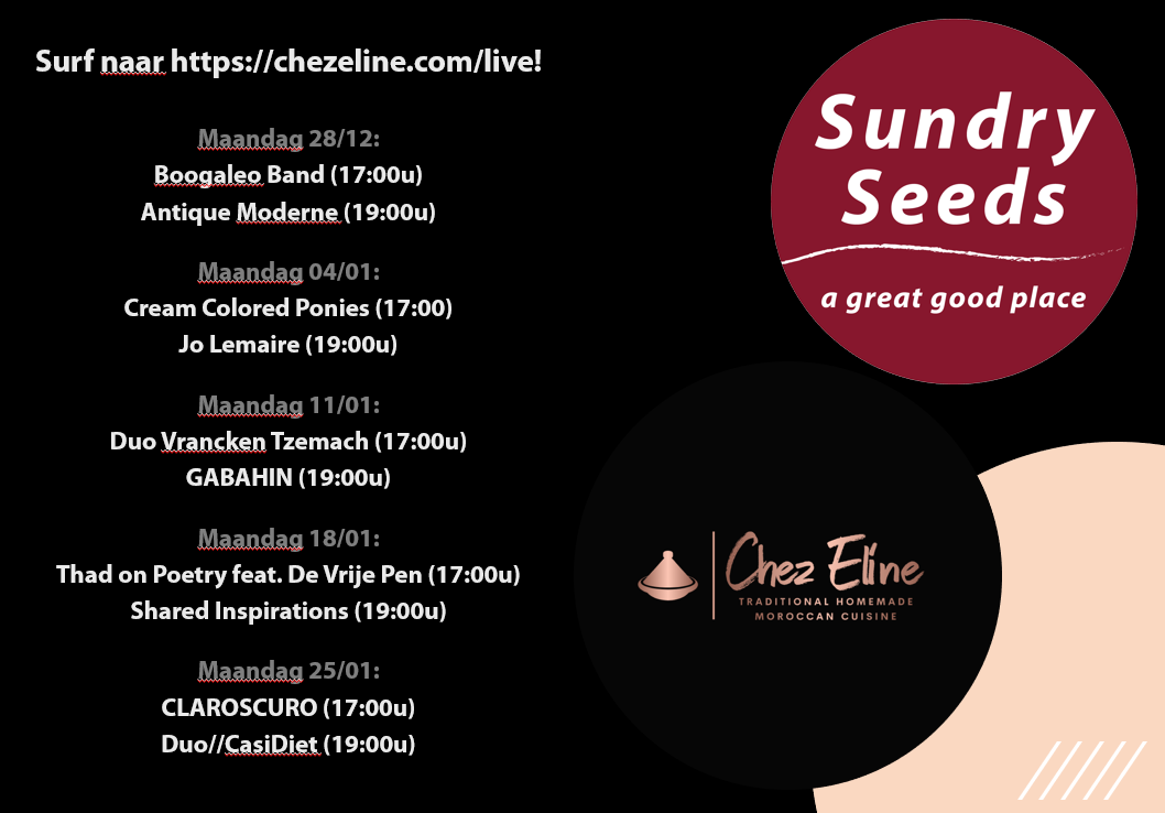 Chez Eline gaat de artistieke tour op. In september 2020 waren de concertjes van Menus Musicales een succes. Ze kunnen nu niet meer live doorgaan maar wel via streaming. Elke maandagavond staan er twee groepen geprogrammeerd om 17.00u.