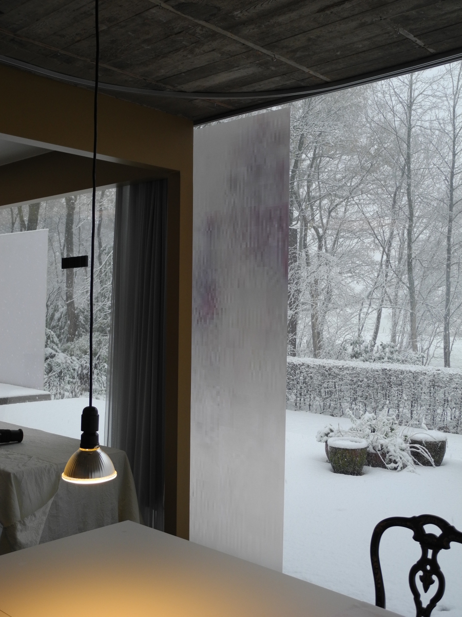 Jonas Vansteenkiste, ‘Bruise’: is een reeks van opgekleefde strips in overeenstemming en als antwoord op de architectuur van de woning. Het werk neemt de vorm aan van grote fysieke kneuzingen zowel op de menselijke huid als in een tweede interpretatie op de huid van de architectuur.